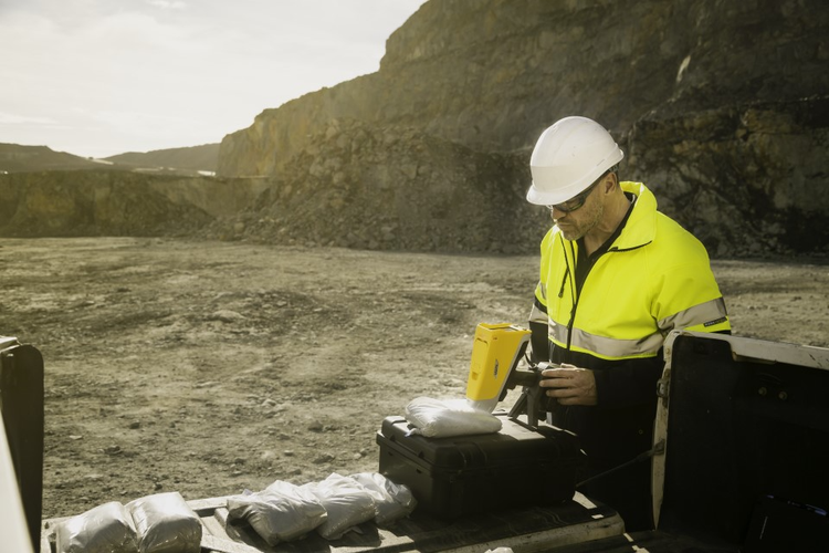 L'analyseur XRF Vanta Max analyse un échantillon de sol sur le terrain.