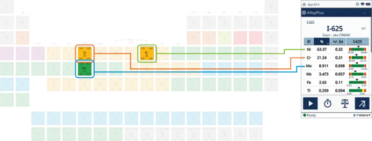 Finalement, l’Axon Technology™ d’Olympus traite le spectre d’énergie et affiche la composition élémentaire de l’échantillon analysé. Dans le cas des métaux, la composition élémentaire est mise en correspondance avec une nuance en particulier.