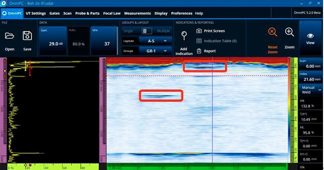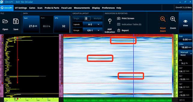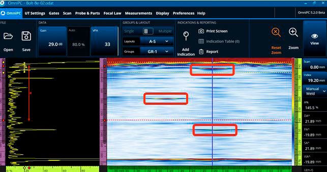 Dai risultati abbiamo anche supposto che la sonda anulare phased array sia efficace su bulloni con un foro al centro. Tuttavia si ritiene che i fasci della sonda lineare phased array possano essere ostacolati da questa peculiarità, rendendo impossibile il rilevamento di difetti. Test successivi sono stati eseguiti su bulloni reali con un foro centrale per convalidare i vantaggi delle sonde anulari phased array su questi tipi di bulloni.