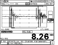 Typical Procedure: The waveforms below show simultaneous measurement of cladding and core thickness in a typical clad aluminum cooking pot, using an M208 transducer. In this case measurements are made between two echoes representing the outer surface and the cladding/core boundary, between the echoes representing the two surfaces of the core, and between the echo from the core/cladding boundary and the inside surface of the pot. As with any ultrasonic thickness measurement, accuracy is dependent on proper sound velocity calibration. Velocity calibration must be performed for each material being measured, on samples of known thickness.