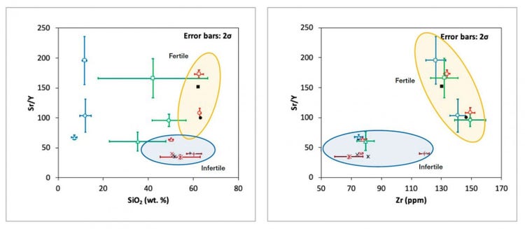 - I dati acquisiti con analizzatori pXRF, tarati in base a dati convenzionali di rocce intere, possono essere usati al posto di dati analitici convenzionali di rocce intere per costituire il grafico di discriminazione prospettica del rame del Sr/Y in funzione del Sr/MnO.