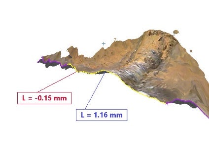 La nostra nuova funzione di analisi del Profilo permette di generare una precisa sezione trasversale di un modello 3D in base a un piano definito dall'utente, evidenziando le rugosità superficiali in una specifica area. Con soli due punti di misura è possibile creare facilmente una sezione trasversale. Una volta che viene definita una superficie di riferimento, l'altezza e la profondità massime sono calcolate e visualizzate simultaneamente. L'analisi del Profilo permette inoltre di passare, in modo pratico, tra i diversi profili superficiali visibili.