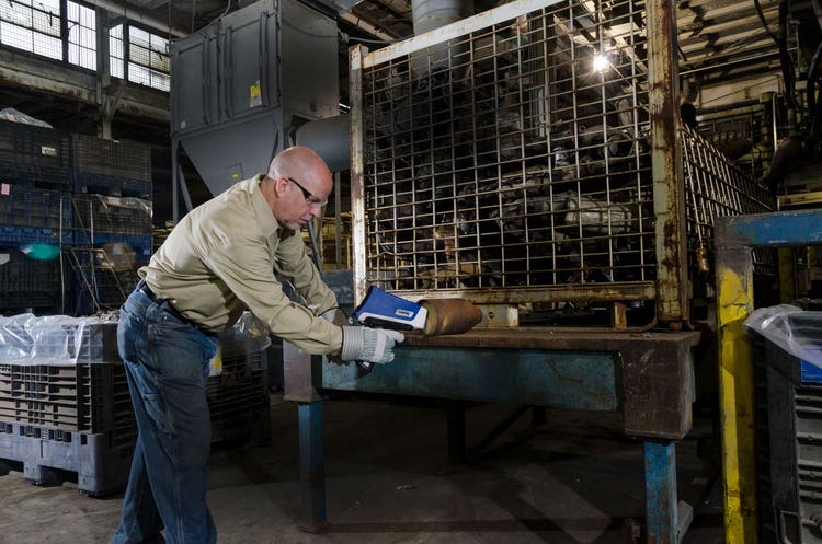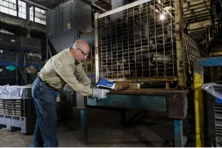 Un tecnico utilizza un analizzatore XRF portatile per analizzare un convertitore catalitico da riciclare in un impianto di riciclaggio