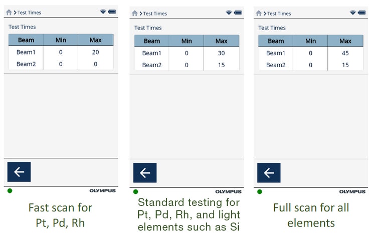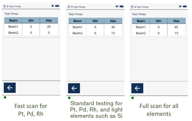 - Analisi veloce per Pt, Pd e Rh: Fascio 1—max. 15 secondi. Un'opzione ottimale per una cernita di base e il rilevamento della presenza di PGM, oltre a tantalio (Ta) e selenio (Se).