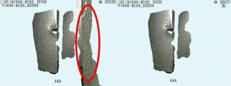 L'immagine sotto mostra un calibro nell'ispezione di un'aereo. La pala dello statore sulla destra blocca la visuale dell'operatore, ostacolando l'acquisizione delle misure. Per concentrarsi sul target è sufficiente utilizzare la modalità slicing e rimuovere la pala dello statore dall'immagine.