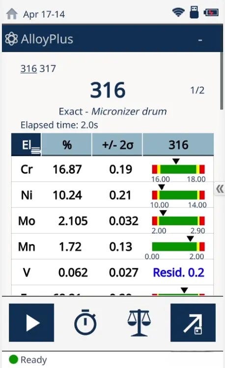 In alcuni secondi l'analizzatore Vanta è in gradi d analizzare la composizione chimica del residuo in metallo determinando inoltre la sua corrispondenza a una specifica qualità di lega (es: acciaio inossidabile 316 [SS 316]) tra quelle presenti nell'integrata libreria di qualità di lega.