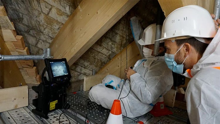 Per ottenere un quadro informativo completo sulle condizioni delle pietre Jean-Christophe Mindeguia ha eseguito dei carotaggi nella volta del coro nel luglio 2021. Descrivendo il processo, Jean-Christophe Mindeguia ha spiegato: "L'effetto del calore sulle volte poteva essere osservato sulla superficie. Tuttavia volevamo osservare l'interno del materiale. Abbiamo effettuato sei carotaggi nella volta del coro, la quale non è stata alterata da oggetti caduti ma la sua struttura è stata deformata dal fuoco. L'analisi di questi campioni ci ha permesso di stimare la temperatura raggiunta dalle pietre. Abbiamo inoltre notato che le carote sono state estratte non integre ma suddivise in diverse parti. Pertanto ci siamo chiesti se è stato il processo di carotaggio a causare questo frazionamento o erano già presenti delle fessurazioni prima del carotaggio. Ho contattato Evident per la fornitura di un videoscopio in grado di acquisire immagini all'interno dei fori realizzati per il carotaggio. I fori hanno dimensioni di quindici centimetri di lunghezza e tre centimetri di diametro".