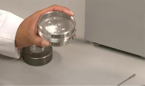 Usare la spatula per posizionare il campione nel portacampione vibrante. Il nostro eccezionale portacampioni assicura che il campione sia privo di effetti di orientazioni preferenziali.
