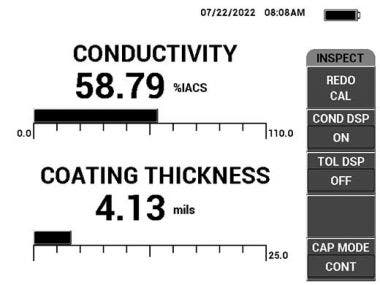 Un secondo modo di misurare lo spessore di un rivestimento non conduttore su un materiale conduttore è quello di usare la capacità di misura della conduttività degli strumenti Olympus serie NORTEC™ 600 (modelli N600C, N600S e N600D). Questa misura si avvale di una speciale sonda per la conduttività che visualizza la seguente schermata invece della standard schermata di impedenza riportata precedentemente. Questa misura vine comunemente usata per determinare la conduttività di un materiale. Tuttavia fornisce anche lo spessore di un rivestimento, per il quale viene considerato il "liftoff" dalla componente o la lontananza della sonda dalla superficie del materiale conduttore. Questo esempio si riferisce a un rivestimento di 0,01 cm (0,004 in.) su una componente da ispezionare in alluminio.