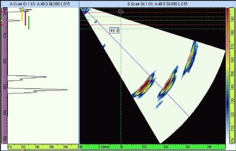 Un'immagien S-scan o una scansione settoriale rappresenta una vista sezione trasversale bidimensionale derivata da una serie di A-scan che sono stati creati in funzione del ritardo temporale e l'angolo rifratto. L'asse orizzontale corrisponde all'ampiezza della componente da ispezionare mentre l'asse verticale corrisponde alla profondità. Questo rappresenta il formato più comune per le ecografie e per le immagini phased array industriali. Il fascio sonoro viene trasmesso a diversi angoli per generare un'immagine a sezione trasversale approssimativamente coniforme. Notare che in questo esempio, trasmettendo il fascio la sonda phased array è in grado di mappare tutti e tre i fori da una sola posizione del trasduttore.