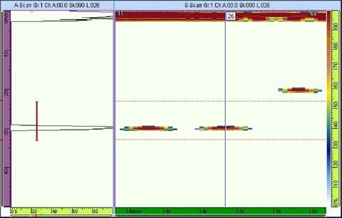 Un B-scan è un'immagine che illustra un profilo a sezione trasversale attraverso una porzione verticale della componente da ispezionare, mostrando la profondità dei riflettori in rapporto alla loro posizione lineare. L'immagine B-scan richiede che il fascio sonoro sia scansionato lungo l'asse selezionato della componente da ispezionare, meccanicamente o elettronicamente, mentre acquisisce i dati rilevanti. Nel caso riportato di seguito, il B-scan mostra due riflettori ad una certa profondità e un riflettore ad una maggior profondità corrispondenti alle posizioni dei fori SDH nel blocco di taratura. Con un rilevatore di difetti convenzionale, il trasduttore deve essere spostato lateralmente lungo la componente da ispezionare.