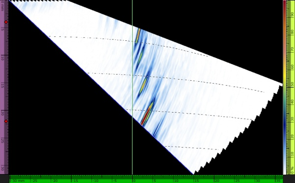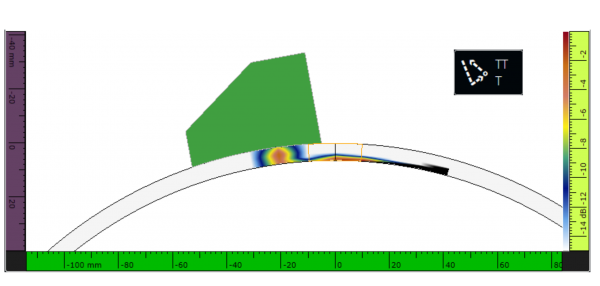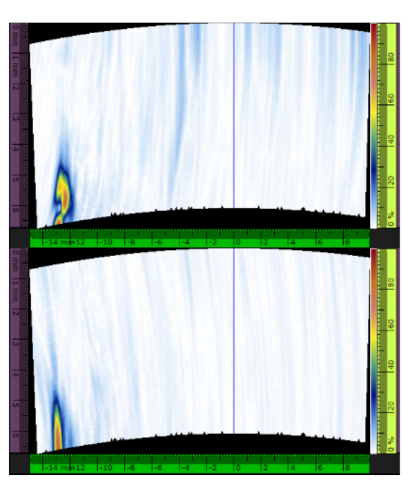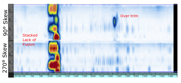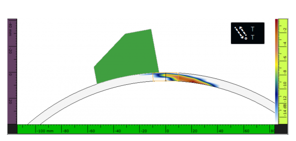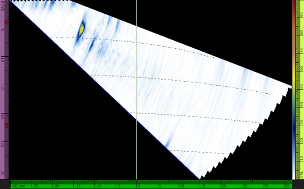 La figura 9 mostra il risultante C-scan PAUT. Nell'immagine sono chiaramente visibili due difetti: il primo (a sinistra) è rappresentato da una fusione incompleta verticale sovrapposta e il secondo è rappresentato da una rifinitura eccessiva.
