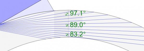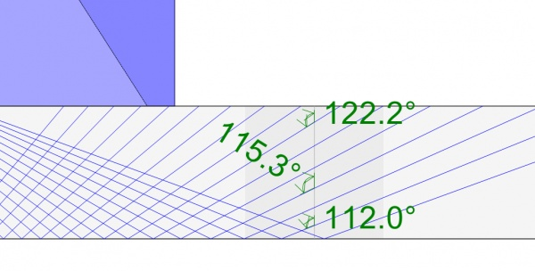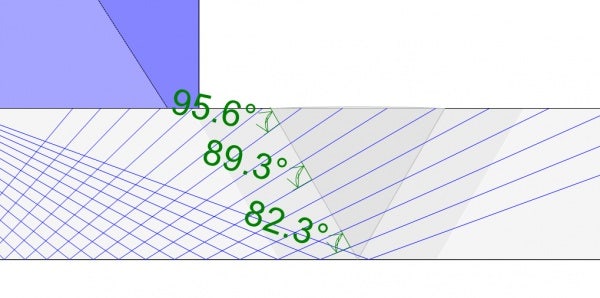 Per aumentare la probabilità di rilevamento (POD - probability of detection), l'angolo di incidenza del raggio acustico sul difetto deve essere perpendicolare il più possibile all'orientazione del difetto. Per una tipica saldatura circonferenziale con smusso a V a 30°, i raggi di una scansione settoriale con un angolo rifratto da 40° a 70° colpiscono lo smusso della saldatura con un'orientazione approssimativamente perpendicolare (vedi Fig. 6a). In uno smusso di questo tipo, i difetti come quelli da fusione incompleta avranno un'orientazione simile all'orientazione dello smusso, pertanto una tipica scansione settoriale 40°–70° fornirà delle capacità di rilevamento ottimali.