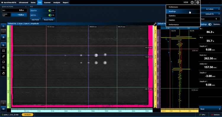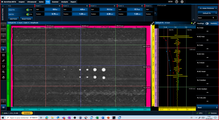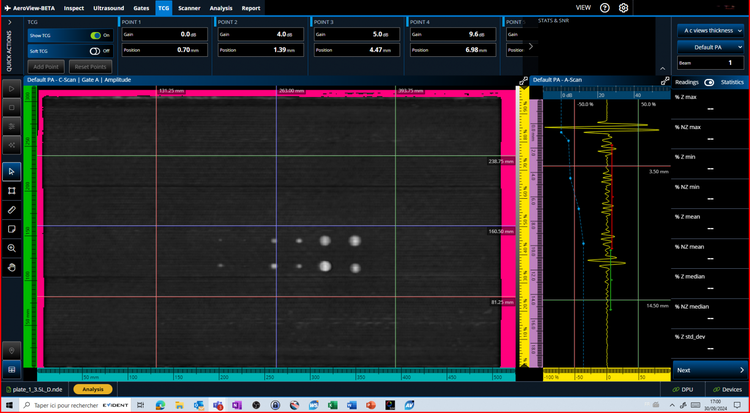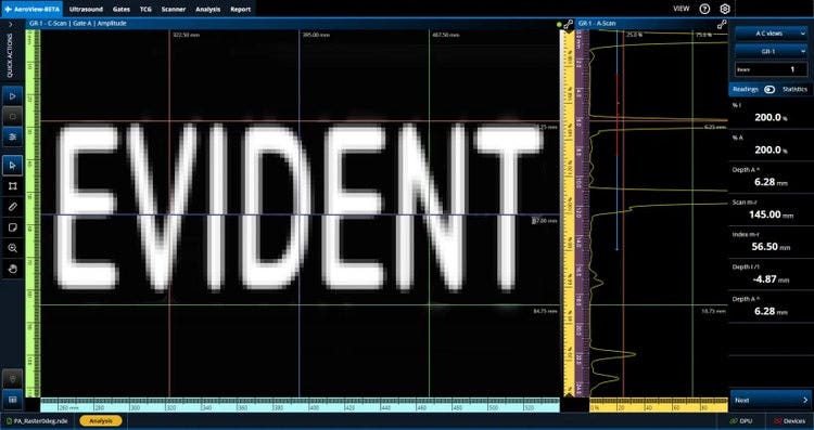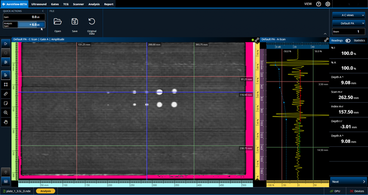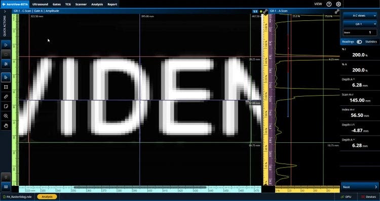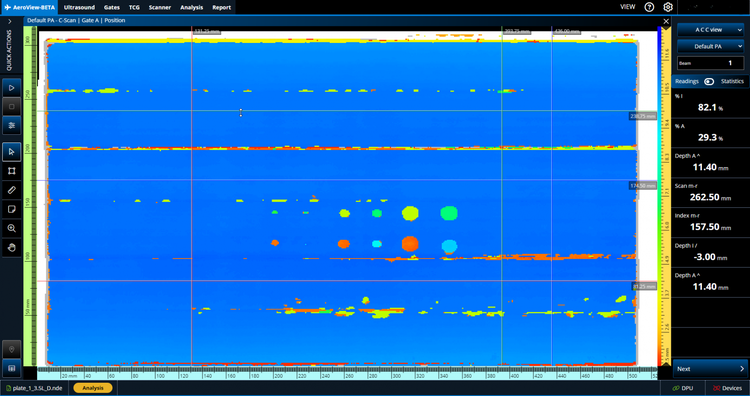 AeroView™ software enables you to acquire and analyze phased array and ultrasonic testing (PAUT) data of inspections performed at 0 degrees with an overlap. This software is specially designed to facilitate the analysis of aviation and aerospace inspection data, for both manufacturing and maintenance applications. It provides you with optimized layout and readings management and advanced analysis tools to ease interpretation of the acquired data and help ensure compliance with the specifications.