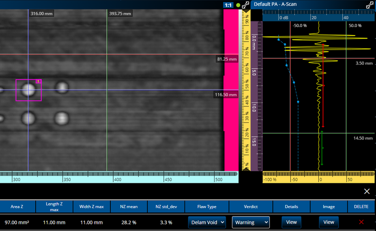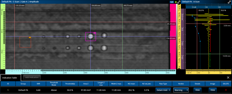 Create an indication table that is customized according to the parameters you need, such as flaw type, readings, threshold, and verdict. The indication table data is stored along with a snapshot image of each indication for your report.