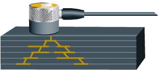 超音波は、予測可能な経路で材質内部を通過します。積層複合材料と結合された超音波探触子で発生された高周波音波が、空気との境界面まで材料内部を通過します。境界面では反射してエコーとなり、それが計測器によって検出されます。構造的に一体化した複合材料では、反射は底面または積層面の内面から発生します。ところが、積層のはく離や表面と平行した亀裂面があると、その損傷部分で反射が発生し、早いタイミングでエコーが戻ります。良品と損傷した材料とのエコーパターンの違いにより、表面からは見えない内部損傷部分を確認できます。