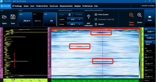以下のOmniScan X3探傷器のスクリーンキャプチャ(図4~6)は、リングアレイプローブの8個の素子を励起した場合に得られた、3か所の欠陥の試験結果を示しています。 リニアスキャン法を使用し、プローブはボルトヘッド上の静止位置で保持されました。