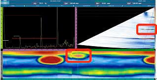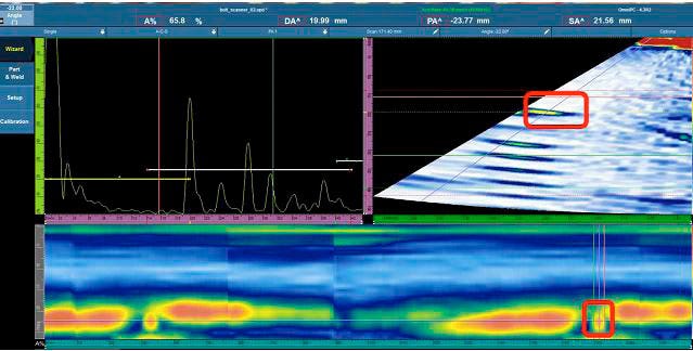 私たちはリングアレイプローブとセクタースキャン法を使用して、ボルトの欠陥をすべて検出しようとしましたが、追加のステップが必要になりました。 ボルトの頭の上面から20 mmの位置にある欠陥を検出するには、ビームの入射角を大きくするためにウェッジを使用する必要がありました。 さらに、この欠陥の信号とボルトヘッド底面の端の信号が近すぎて、区別できませんでした(図12)。