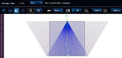 図11: OmniScan X3探傷器に表示されたリニアアレイプローブのビーム模式図
