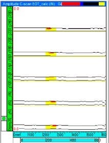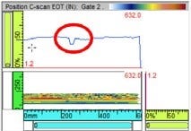 検出された欠陥は、パイプ端部探傷の「可否」判定基準のひとつとして、他の周方向の欠陥と同じビュー内に表示されます。 この方法を使用すれば、直線切断パイプの端から5mmまでの周方向の欠陥を検出できます。 欠陥が検出されない場合、EOTゾーンに対する「可」判定が表示され、そのパイプにEOT探傷が行われたことが実証されます。