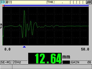 図1は、トレッド厚さが約12.5 mm(0.5インチ)の自動車タイヤを外側トレッドから測定した、鋼鉄製プライコードのエコーを示しています。測定には、39DL PLUS厚さ計とM1036探触子(2.25 MHz)を使用しました。この場合、エコーは最初の正のピークを測定しています。