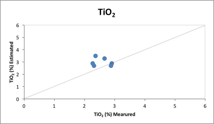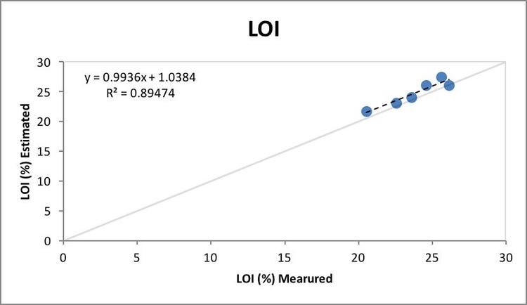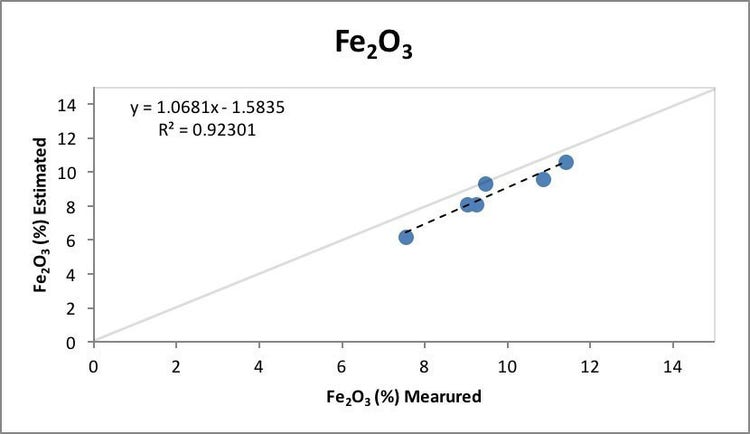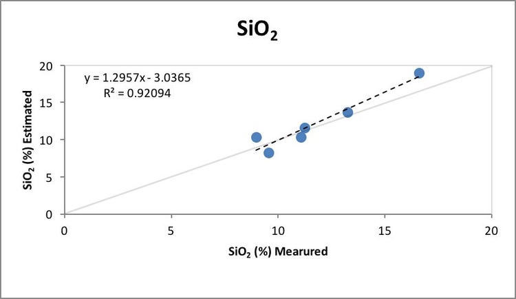 図1: 利用可能なアルミナと反応性シリカに関する、定量ポータブルX線回折計の推定値と、ラボで測定された数値。高い相関を示している。