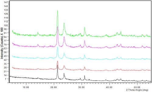 図3: さまざまな収集時間における、ラボ用4 kW X線回折計とオリンパスポータブルX線回折計で得られたX線回折トレース。 図4の凡例を参照してください。