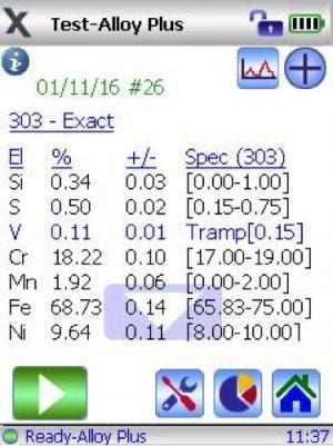 - 包括的な合金品種判定: 合金ライブラリーには500種以上の合金品種が区別されて登録されています。 工業規格に基づく残留元素(トランプ元素)ライブラリーを利用することにより、合金品種のマッチングがより単純になります。ユーザーによる既存ライブラリーの変更や、独自ライブラリーの作成も可能です。