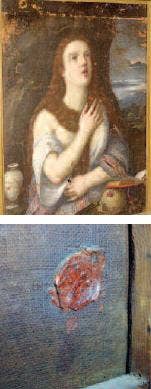 たとえば、左の絵画は、16世紀にベニスで描かれたマグダラのマリアの肖像画であると考えられています。使用されている顔料の蛍光X線分析を行うと、その信ぴょう性を判断できます。絵画の裏面の四隅の赤い封ろうの成分からも、蛍光X線分析で出所や所有者の手掛かりを得ることができます。