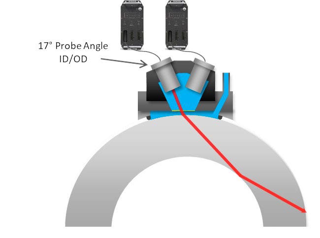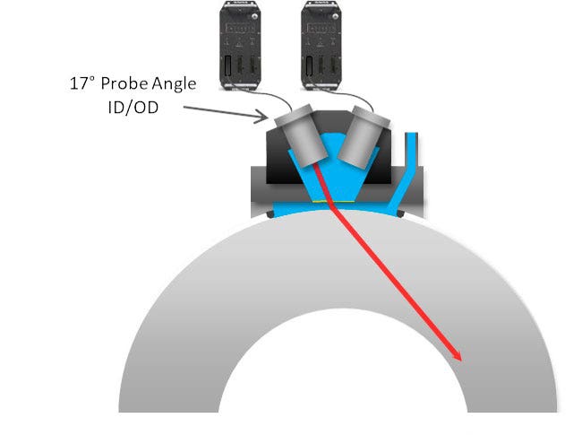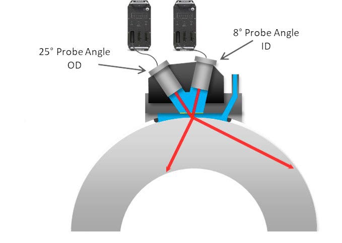 肉厚が50.8 mm(2インチ)を超えるパイプの場合、この回転式チューブ探傷ソリューションは給水ウェッジ内に2つのプローブを異なる角度で設定して、軸方向のIDおよびODのノッチ欠陥を検出します。