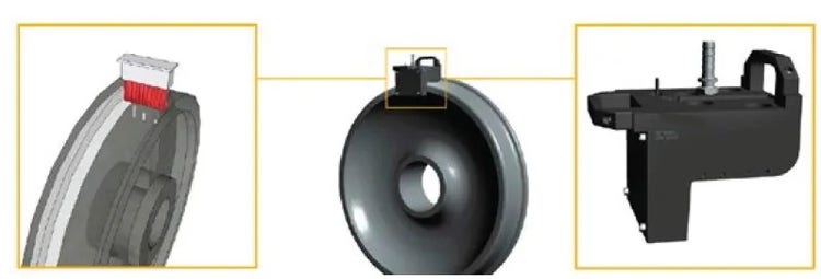 車輪検査システムのフェーズドアレイプローブは、リムをトレッドおよびリム面から検査するとともに、ハブの両側を1分以内に検査します。