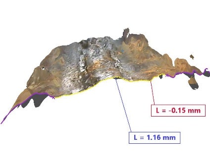 当社の新しいプロファイル分析機能により、ユーザーが定義した面に基づいて3Dモデルの詳細な断面図を生成し、特定領域における表面粗さを強調することが可能です。 2点の計測点があれば、簡単に断面図を作成することができます。 基準表面が設定されると、最大高さと最大深さが同時に算出・表示されます。 プロファイル分析により、複数の表示可能な表面プロファイル間の切り替えを簡単に行うこともできます。
