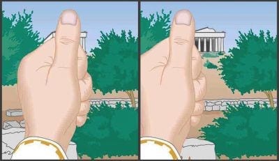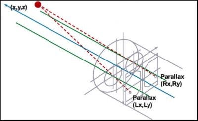 ステレオ計測は、私たちの奥行知覚認識と同じように機能します。私たちの脳は、常に視差(ある画像と別の画像での見え方の変化)に基づいて距離を計算しています。下に示す画像を見ているとき、我々の脳は、たとえ一方の目で見たときと、他方の目で見たときでは対象物が移動しているように見えたとしても、実際は動いていないことを理解しています。この見え方の違いは、距離に反比例します。何かが近くにあればあるほど、両眼それぞれの見え方の違いは劇的に大きくなります。これは、私たちが対象物にどれだけ近いかを、ある画像ともうひとつの画像における対象物の見え方の差の大きさに基づいて直接測定できるということを意味します。