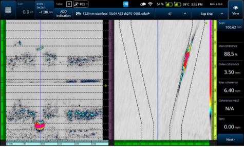 PCI は端部反射に対する感度が高いため、分析用に欠陥の正確な形状が表示されます。端部回折の「ホットスポット」により、溶接部の融合不良(LOF)などの欠陥のサイジングが容易になります。