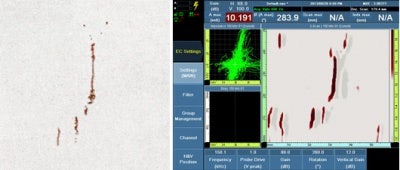 ECAでは表面割れを評価できるほか、多くの場合は亀裂の深さを測定できます。 適切なプローブと校正設定を用いれば、SCCなどの短い欠陥を正確に検出できます。