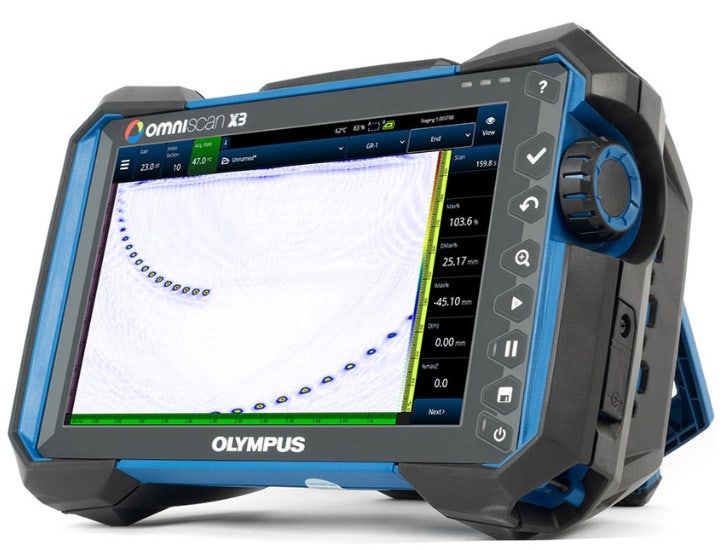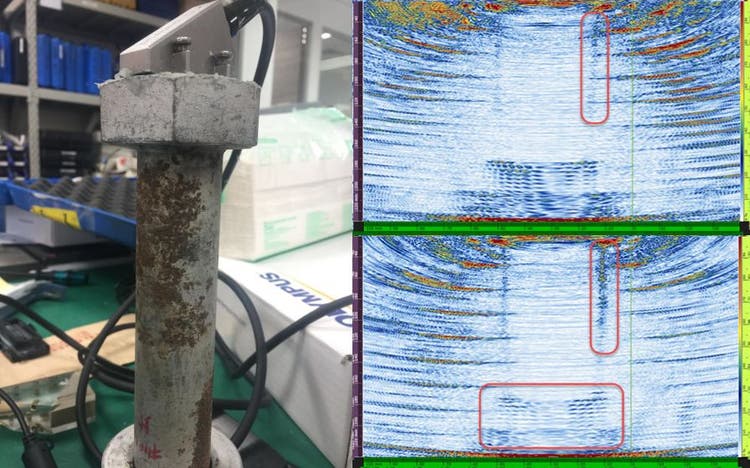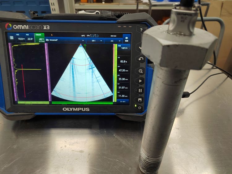オリンパスのフェーズドアレイプローブとOmniScan X3探傷器を用いることで、ボルト内部の割れやその他の重大な欠陥を検出できます。 ここでは当社ラボでの試験のみを例にあげていますが、OmniScan X3装置は持ち運びが非常に楽で、現場にも携帯できるため、稼働を停止することなくメンテナンス検査が実施できます。