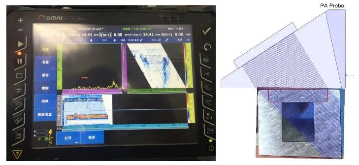以下は、OmniPC™ソフトウェアを使った検査分析のスクリーンショットで、校正ブロックのスキャン結果を示しています。 表面付近のポロシティだけでなく、縦方向の接合部の融合不良も明らかで、正しく溶接されていません。