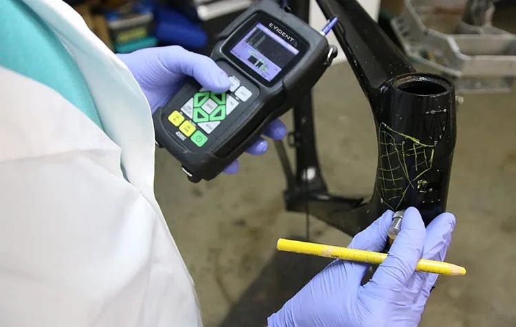 業務は、超音波スキャンと損傷マッピングに45MG厚さ計を使用することから始まります。 非破壊検査機器は、内部の層間剝離の検出に使用します。自転車のフレームを切断しなくても、複合材料層の内部構造を「見る」ことができます。