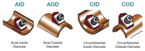 The following table will help you decide which wedge type to use for small-diameter part inspections. Please note that this list is only intended as a guideline. Additional factors other than part diameter may restrict wedge selection.