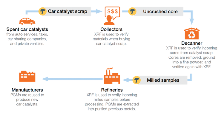 Colectori. XRF este utilizat pentru a verifica materialele atunci când cumpărați deșeuri de catalizator. Nucleu nezdrobit. Decanner. XRF este utilizat pentru a verifica nucleul primit din deșeurile de catalizator. Miezul este îndepărtat, măcinat într-o pulbere fină și verificate din nou cu XRF. Mostre măcinate. Rafinării. XRF este utilizat pentru a verifica mostrele măcinate înainte de procesare. PGM extrase în metale prețioase purificate. Producători. PGM sunt utilizate pentru a produce catalizatoare auto noi.