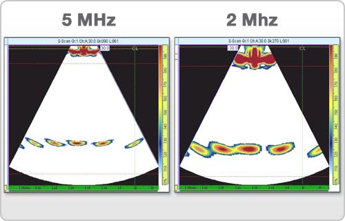 どのような物質でも減衰は周波数に比例して増加するため、5MHzでの検査は2MHz以上に高いゲイン・レベル(感度レベル)を必要とします。しかし、超音波フェーズドアレイを利用したシステムでは、多くの場合、ゲインは制約要素ではありません。