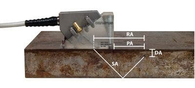 従来型の超音波探傷器(UT)と同様に、超音波フェーズドアレイ探傷装置(PA)は欠陥やその他のエコー源の位置を特定するソフトウェアツールを搭載しています。通常、ソフトウェアツールはエコー源の探知をフェーズドアレイプローブに対するエコー源の表面位置、試験体表面に対するエコー源の深さ、そしてビーム入射点からエコー源までのビーム路程距離により行います。1回反射を用いる場合、超音波フェーズドアレイ探傷装置は反射が発生するレグの位置を特定します。