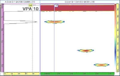 この4番目の画面は全フォーカルロウのA-スキャンを合成表示していますが、全アパーチャーからのエコー信号が合計され、その結果、3個のドリルホールからのエコー信号が同時に表示されています。