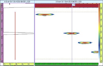 その結果が次の画像です。ユーザーがカーソルで選択したアパーチャーのA-スキャン波形と共にスキャンエリア内のドリルホール(横穴)の相対的位置が示されていることが良く分ります。このA-スキャン波形は29~45番の振動素子を使って形成されており、この場合のアパーチャーは49個ある内の29番目が選択されています。このポイントで超音波ビームと左から2番目のドリルホールが交差しています。