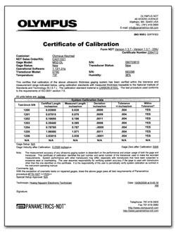 校正証明は、特定の試験条件下における超音波厚さ計の測定の正確性を文書化するプロセスです。 製造元の校正証明は通常、米国標準技術局(NIST)に対してトレーサビリティのある厚さの標準試験片を用いて実施されます。 文書化された試験条件下での測定の正確さは、通常、所与の厚さ計、探触子、厚さ計セットアップ、および材料に対して製造元が確立した許容誤差と比較されます。