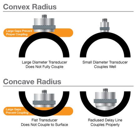 形状: 部品の表面曲率が増すと探触子と試験片との間の音響結合効率は低下するため、曲率半径が増すと探触子のサイズは一般に小さくする必要があります。 極めて鋭利な半径、特にへこんだ曲線部の測定では、適切な音響結合が得られるよう、特別に形状を合わせた遅延材付き探触子または非接触水浸型探触子が必要なことがあります。 遅延材付き探触子や水浸型探触子は、溝や空洞、アクセスが制限される同じようなエリアでの測定にも使用できることがあります。