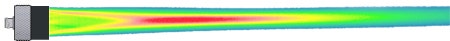 ところが実際のビーム形状は複雑で、音圧勾配は横軸、縦軸の両方向にあります。下のビーム形状では、赤い部分がエネルギーの最も高い部分を表し、グリーンとブルーの部分はエネルギーが相対的に低い部分を表しています。