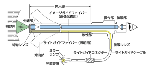 工業用ファイバースコープは、数千から数万本の光ファイバーを束ねたイメージガイドを通して、直接目視観察できる軟性内視鏡です。挿入部、操作部、接眼部から構成され※、画像伝送用イメージガイドファイバー、照明用ライトガイドファイバー、湾曲ワイヤーは内部に組み込まれています。