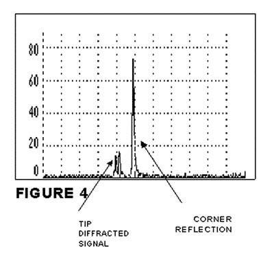 この方法は、板厚のおよそ5~35%の範囲の浅い割れきずをサイジングするのに使用されます。この方法では、割れきずの先端からの信号の到着時間から、割れきずの深さを判定します。このプロセスを単純化するために、探傷器の校正は各画面区分が特定の深さの傷に対応するように行います。通常、最初の5画面区分のそれぞれを、材料の板厚20%を表すように選択します。そのため、板厚の20%を通る割れは第4画面区分で信号を生成し、板厚の40%を通る割れは第3画面区分で信号を生成します。先端信号とコーナー反射との分離もこの技法で記録されます。この分離から得られる情報により、オペレータは割れきずの深さを最終的かつ正確に判定できます。板厚の20%を通る欠陥からのA-スキャンの例を図4に示します。