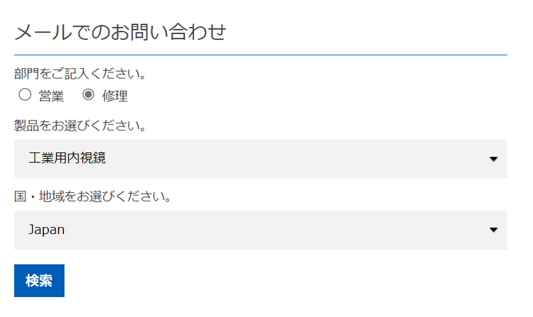 「メールでのお問い合わせ」から、部門には「修理」製品には「工業用内視鏡」をお選びください。